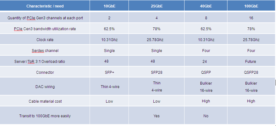 数据中心对于以太网的需求,来自两个最重要的考量,一个是节能,一个是成本。与数据中心发展相关的领域,包括了“云”的发展,以及 leaf/spine矩阵式网络架构。随着服务器性能的进一步提升,也随着数据中心内从leaf到spine层连接在向100gbps升级,那么服务器从现有的10gbps向25gbps/50gbps升级已经很有现实意义:因为10g的以太网速度标准往往满足不了需求,而100g又太贵了,25g和 50g以太网标准的出现正好弥补了这两者的不足。此外,25gbps和50gbps每通道技术将是未来100gbps(4个25gbps)和400gbps(8个50gbps)以太网标准的基础,因此业界普遍希望利用25g传输速率来替代现有的10gbps速率。