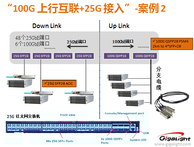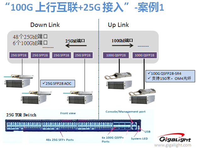 相对于40ge,25ge享有单一通道的成本优势。如果是40g,则需要多个物理通道,因为它利用的是10g技术。对25g以太网来说,关键优势是很多组件早已研制完成:因为100g以太网标准就是用 4个25gbps汇聚而成的。所以两种技术所用的组件可大量生产,从而推动价格的下降。通过四通道sfp接口(qsfp),100g拆分成4个25g,40g亦可以拆分成4个10g,因此多速率的以太网产品得以发展和应用。