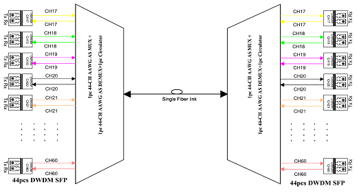 下图是易飞扬可调光模块(sfp /xfp)和 50ghz dwdw 1u机箱设备组合方案示意图,供大家参考。