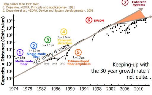在遥远的上世纪80年代,研究超快光通信的科学家们开始研究相干光通信。相干传输的优势很明显:灵敏度高(传得远),带宽大。但是在之后的90年代,掺铒光纤放大器(edfa)和wdm(波分复用)等技术闪亮登场,分别取代了相干传输原有的优势。相干技术从此被打入了冷宫。