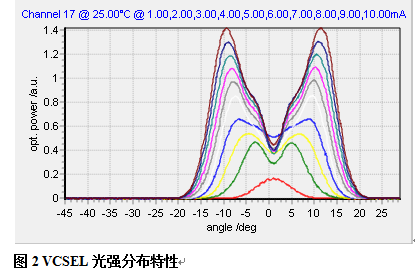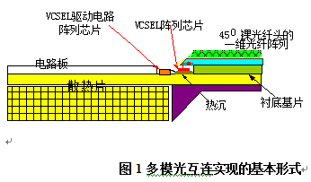 二.并行多模光纤耦合技术的积累与突破 并行光模块光互连技术的光路耦合是一个大的问题,相比流行的plastic lens方案,易飞扬(gigalight)采用了一种更为简单高效而可靠的光纤耦合工艺技术。这种工艺技术采用了接近于45度角(图1)的全反射面对vcsel的发光进行反射形成产品所需要的光路,但是这种简单的应用原理,易飞扬(gigalight)在实际产品制作中加以了精确的理论计算和严谨实验验证。对于反射角度的选择,我们经过对vcsel的激射光特性(图2),采用光学模拟软件分析(图3),以及对vcsel光入射角全反射原理,确定我们最优的反射界面角度为趋近于45°的某个值,同时经过对光纤面的特殊材质处理(图4),使得光纤耦合效率由最初设计方案43%~47%提升到了75%~80%。