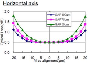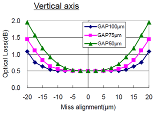 现有实现并行光模块产品方案,都是基于vcsel阵列和光纤阵列耦合方案,采用chip on board工艺实现低成本高效率生产要求。在这个工艺中,芯片的贴装精度直接影响光耦合的效率。我们经过数据对比分析,得到关于贴装精度偏差对光损失的影响(图10,图11)。从图中我们了解,多模耦合精度在±5um可以保证耦合效率。根据研究,我们使用了高精度贴片工艺,实现保证产品耦合的优良。