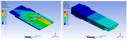 五.必要的热学设计,保证并行光模块的良好使用 众所周知,并行光模块是器件高度集成化的产品,内部多通道集成数目增加,使得功耗和i/o引脚大增加。例如在qsfp- psm模块中,四个驱动ic的功耗占据了近整个模块的50%以上的热量。在狭小的qsfp空间内,散热是一个很大的问题。如果长期散热不良,会造成内部元器件的老化,缩短使用寿命。而体现更为直接的是激光器的功率会随着温度的增加而变化,由激光器的特性(图14)可知:ith会变得更大,为了拿到足够的传输功率,模块会加大偏置电流,使得整体模块的功耗直接增加,形成恶性循环,这对模块是十分不利的。因此在产品开发周期,我们就要很关注产品的热学设计。注意模块内部芯片间的布局以及散热通道良好。在进行产品设计时就已经进行严格的热学设计(图15),再通过实验的热量测试进行修正和改进散热效果(图16)。