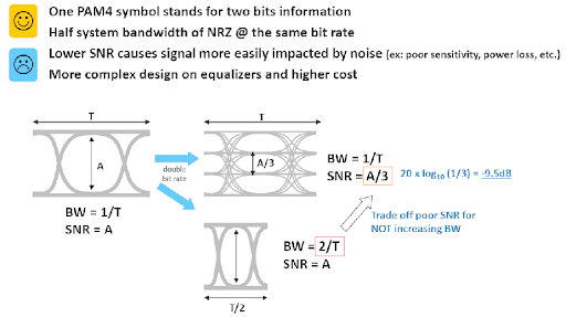 如图所示,pam4通过四电平幅度调制,每个电平值可以承载2bit信息,代价是对噪声更为敏感。如果我们观察nrz信号的眼图,假设比特周期为t,幅度为a,那么信道带宽为比特周期的倒数(1/t)。比特率越高,比特周期越小,信号带宽越大。通常也会有信噪比(snr)要求,这与信号幅度相关。从纵向看,眼图张开的幅度越小,那么从接收端以固定的信噪比分辨出原始信号就更加困难。