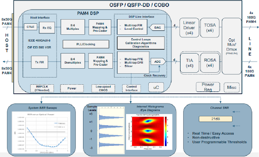 然而在性能上cdr对于整个电路的提升远不及dsp。dsp就是高速数字处理芯片,除了提供cdr能提供的数字时钟恢复功能之外,还可以对aoc产品进行色散补偿操作,去除噪声、非线性等干扰因素。受限于光模块的封装体积,400g aoc的平行路数不会很多,再加上电光器件带宽局限,人们必须要提高单波速率。对于单波100g以上的应用来说,目前的发送端电驱动芯片与光器件都达不到50ghz以上的带宽,因此在发送端相当于引入了低通滤波器,在时域上的表现就是码间干扰。